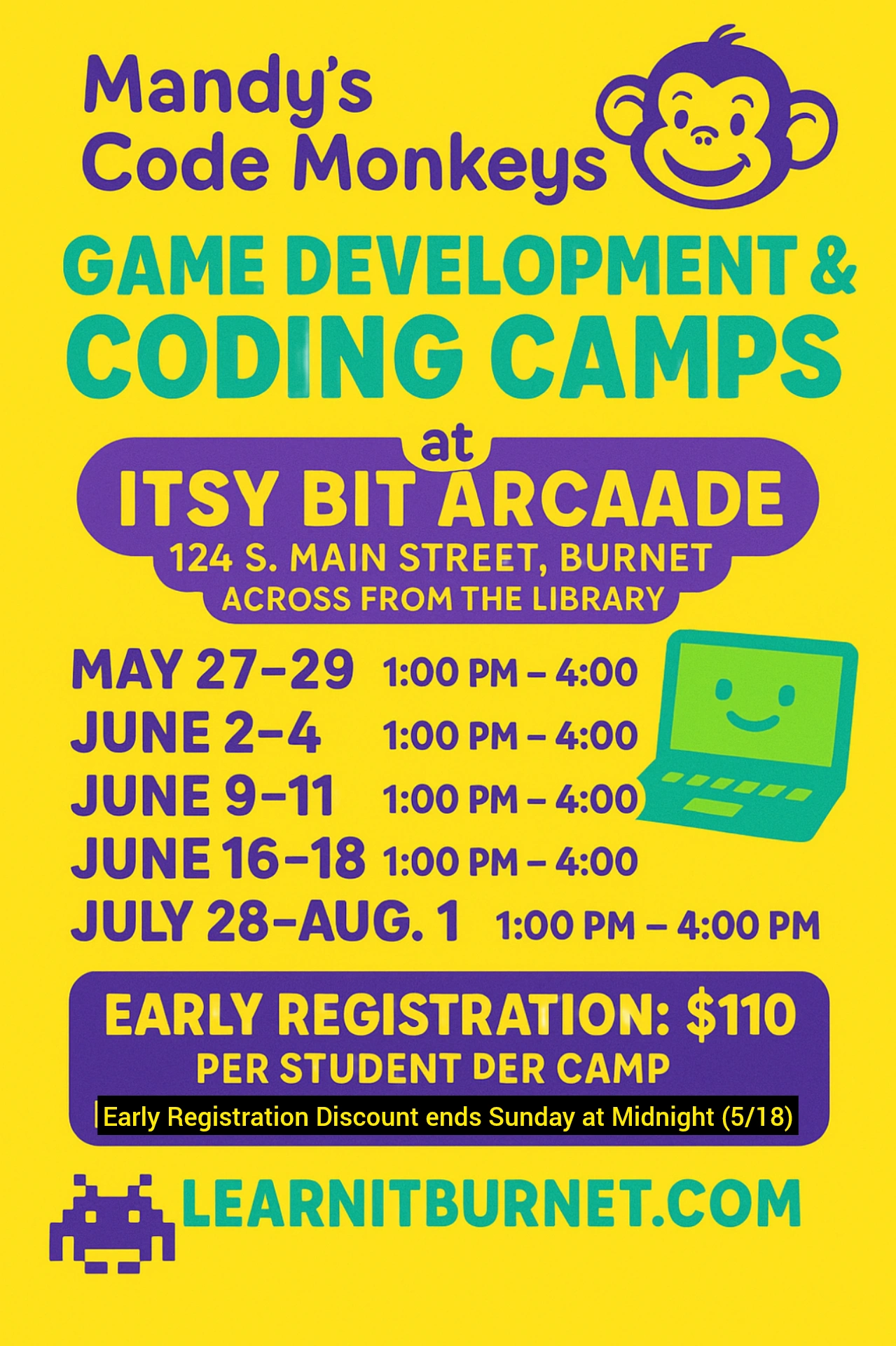 Welcome to Mandy's Code Monkeys dev space, the ultimate destination for budding game developers. Right in the heart of Burnet, we are right off of HWY 29. Our fun workshop space is designed to inspire and ignite creativity. Our space is equipped with student tables, laptops loaded with professional development environments, and a projector for seamless, interactive learning. To spark inspiration and keep the energy high, we also have classic arcade machines. Here, students dive into the full flow of game development in an engaging and supportive environment. Join us for a unique educational experience where every day is a new adventure in game design and coding games! 🎮